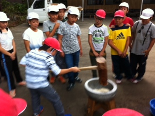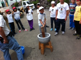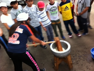 オリエンテーリングの前に餅つきをして気合いを入れてます。始めての子もいれば手慣れた子も。