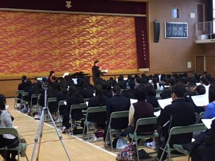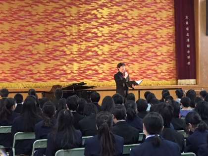 港晴小学校、築港小学校の5.6年生、築港中学校の1年生を対象に、人権講演会が行われました。講師に、声楽家・ボイストレーナーの新井俊稀さんを招き「僕は なに人? そう 音楽人!」をテーマに講演していただきました。