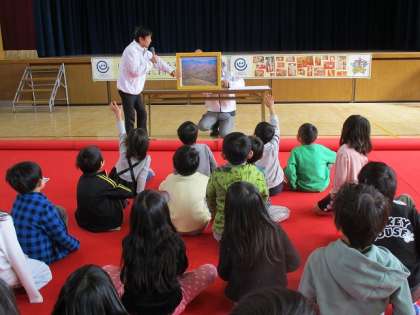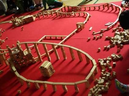 積み木体験学習を行いました。まず、マットに寝転んで、たくさんの積み木のシャワーをあびました。その後、3種類の形の積み木で思い思いの作品を作っていきました。家や学校やロボットを作ったり、高く積み上げたり・・・。約1万個の積み木を用意していただいていたので、足りなくなることもなく、次々に作っていきました。しばらくすると、友達の作品と自分の作品を道や橋でつなげて、それがどんどん広がって、大きないくつかの作品が出来上がりました。いろいろな発想が組み合わさって、素晴らしい作品ができました。最後に、紙芝居で自然の大切さを教えてもらいました。