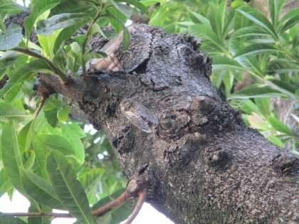 今朝、学校へ到着すると、元気なセミの声が響いていました。(どこにいるのかな?)と探してみると…。こんなところに、いました、いました。