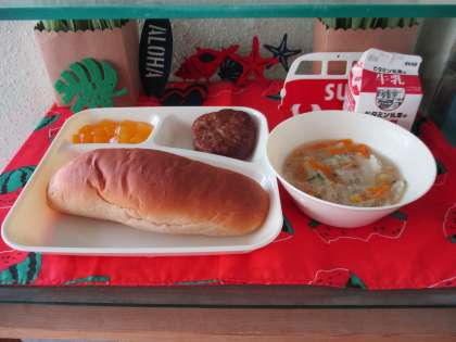 2学期スタートの今日8月26日(火)、この日から2学期の給食も始まりました。2学期最初の献立は「焼きハンバーグ・豆乳スープ・ダイスゼリー(みかん)・こくとうパン・牛乳」でした。