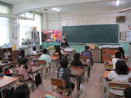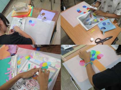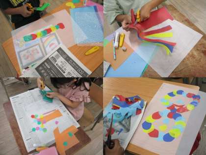 4年生の子どもたちが、図画工作科の学習で「光のさしこむ絵」の作品づくりに取り組んでいました。動画を見たり説明を聞いたりした後、子どもたちは色うす紙等を思い思いの形に切り取り、重ねたり組み合わせたりしながらトレーシングペーパーにのりづけし、自分の思い描くイメージを絵に表していました。光がさしこむと、いったいどんな絵になるのでしょうか?完成が楽しみですね。
