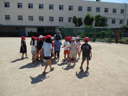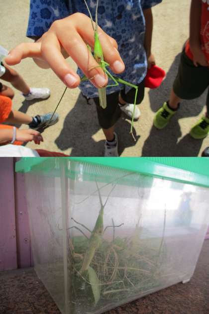 2時間目の授業が終わった直後、運動場から大きな歓声が聞こえてきたと思ったら、1年生の子どもたちの人だかりができていました。生活科「いきものと なかよし」の学習で虫を探していたところ、大きなショウリョウバッタを見つけたとのことでした。