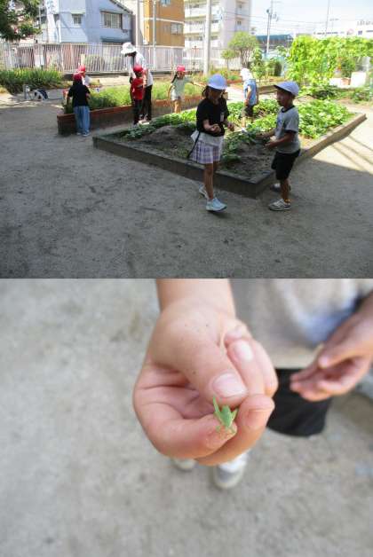 その後の休み時間には、学習園で熱心に虫を探す子どもたちの姿が見られました。小さなショウリョウバッタがぴょんぴょんとんでいました。
