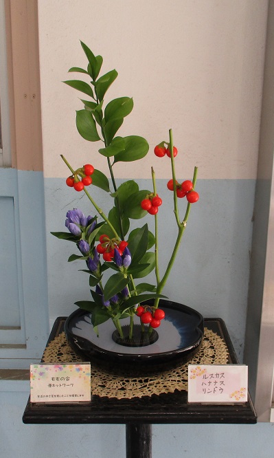 ももの会 港ネットワーク様より、ルスカス、ハナナス、リンドウの花を玄関に生けていただきました。