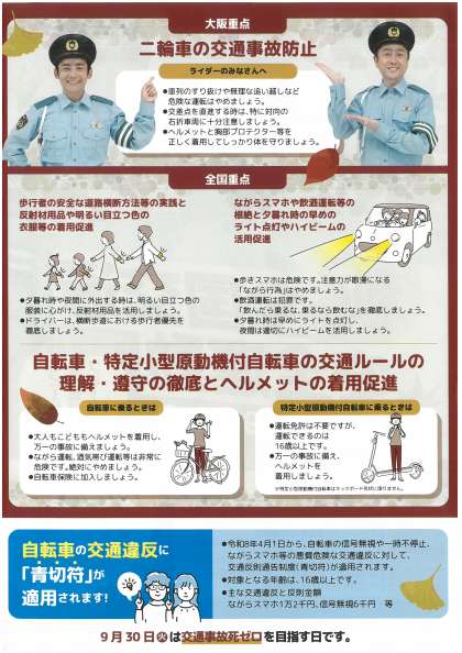 今年の大阪での重点は、自転車を含む2輪車の交通事故防止です。