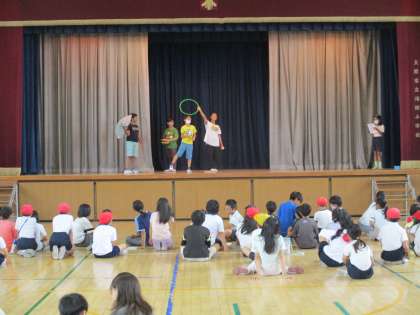 今週月曜日の全校朝会同様、久しぶりに全校児童が講堂に集合して児童集会を行いました。今日のゲームは「投げた物は何だ」ゲームでした。「投げた物は何だ」ゲームとは、集会委員が講堂舞台上のカーテンとカーテンの間に投げた物をよく見て当てるクイズです。さて、上の写真の投げられた物、みなさんはわかりますか?(写真がぶれていてわかりにくいですが…)