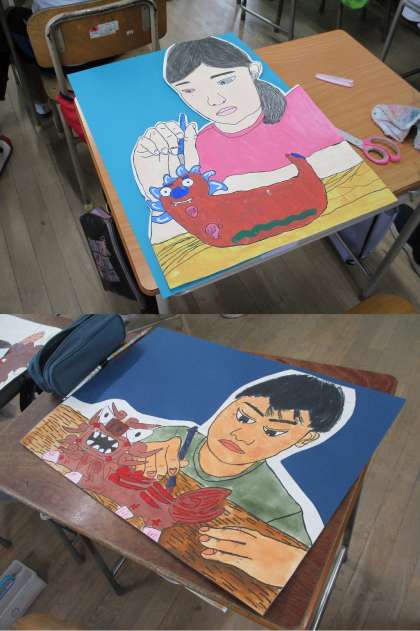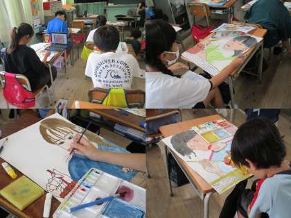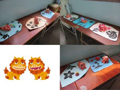 図画工作科の学習で「シーサーを作る私」という題材の図画を描いていました。学習者用端末を活用して撮影したシーサーを作る自分の写真をもとに、熱心に作品づくりに取り組んでいました。みんな、とても上手に描いていたので、たいへん驚きました。廊下には、実際に作ったシーサーが展示されており、さらに驚きました。個性豊かなシーサーが静かにたたずんでいました。