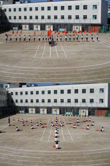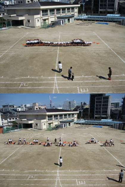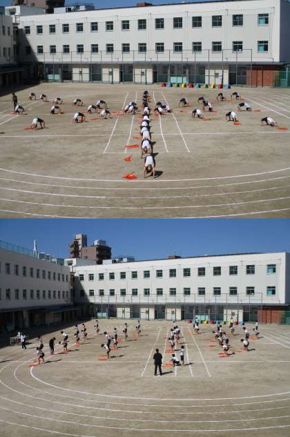 10月6日(月)の放課後、運動場にラインが引かれました。各学年の運動会に向けての練習も、いよいよ熱を帯びてきました。写真は5・6年生の団体演技の練習の様子です。