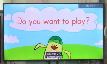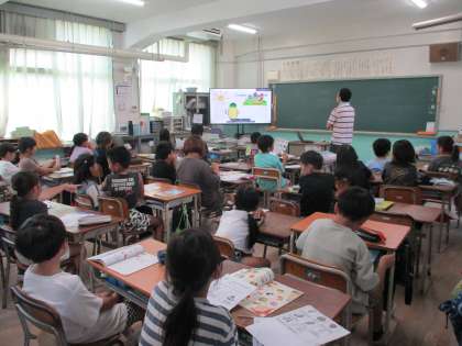 3年生の教室から元気な声が聞こえてきました。教室の中を見てみると、弁天小学校から来ていただいている英語専科の先生と外国語活動に取り組んでいました。大型テレビから流れてくる音をよく聞きながら、リズムに合わせて発声し、英語の音に慣れ親しんでいました。