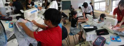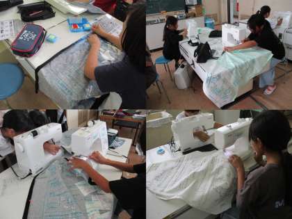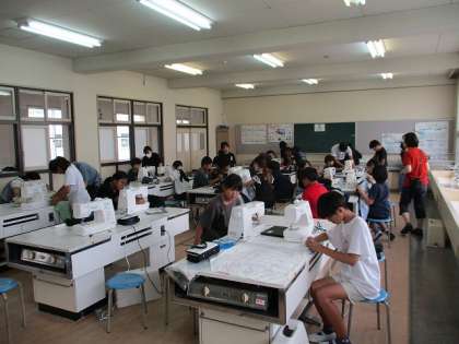 家庭科の実習で「エプロン」の製作に取り組んでいました。縫うところを三つ折りにし、アイロンをかけたり、まち針で布をとめたりして、ミシンで上手に縫っていました。