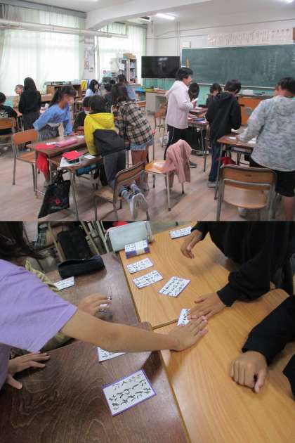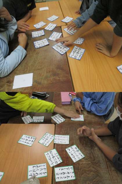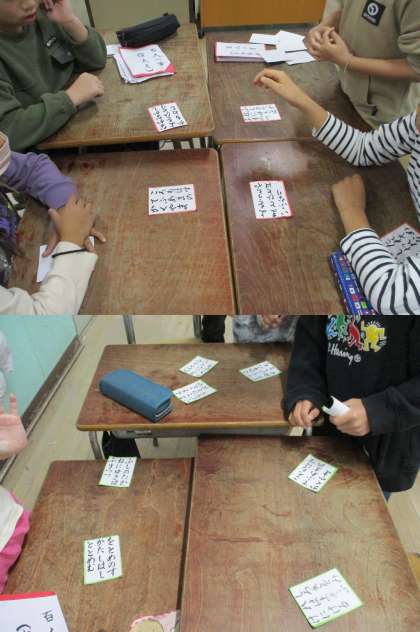 4年生の子どもたちが、国語科学習の一環として、『百人一首』でかるた遊びをしていました。先生の読みあげる「上の句」を聞いて、「下の句」が書いている取り札を探している様子は、とても楽しそうに見えました。『和の文化』である『百人一首』に十分に親しんでいました。