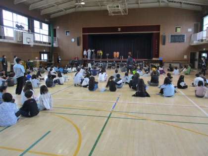 11月6日(木)の児童集会は「古今東西」ゲームでした。「古今東西」ゲームとは、テーマにそった答えを連想し、回答の合間に手拍子でリズムをとりながら順番に答えていくゲームです。集会委員会が設定したテーマは『ポケモンの名前』でしたが、答えるのがむずかしい場合は、各たてわり班で高学年のリーダーを中心に、臨機応変にしていたようです。なごやかな雰囲気の中、子どもたちは楽しく活動していました。