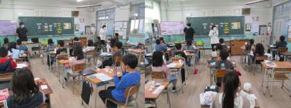11月12日(木)、「児童の歯や口の健康の保持増進と歯科衛生に対する認識を高め、健康な歯をむし歯から守り、すこやかな成長を図る」ことを目的に「フッ化物洗口」を実施しました。歯科衛生士の先生、歯科医の先生にお越しいただき、むし歯の予防についての理解を深めました。また、「そしゃくチェックガム」を使って、噛むことの大切さや噛む力について学びました。