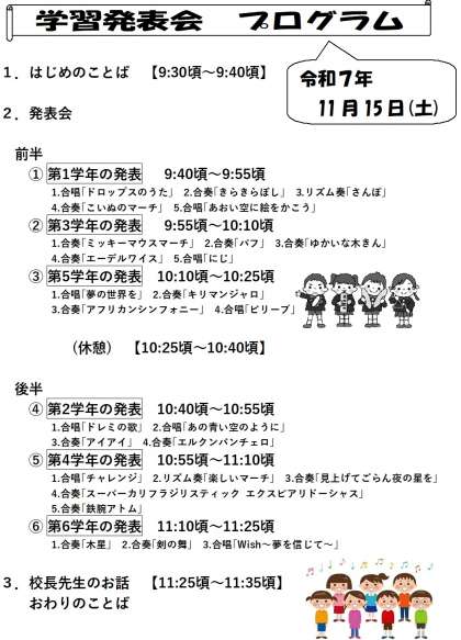 保護者・地域の皆様におかれましては、たいへんご多用の中ご来校くださり、子どもたちの精いっぱいの発表に温かい拍手を送っていただきまして本当にありがとうございました。この場をお借りして、厚くお礼申しあげます。今後とも、本校の教育活動推進にご理解、ご支援、ご協力賜りますよう、よろしくお願い申しあげます。