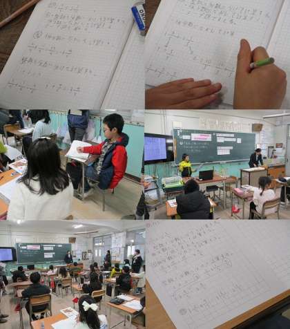 今日の研究授業では、「帯分数のたし算のしかたを考えよう」というめあてで授業実践に取り組みました。4年生の子どもたちは、今まで学習したことをもとに、「整数と分数に分けて考える」「帯分数を仮分数になおして考える」「テープ図をもとに考える」等、自力解決に向けて熱心に学習に取り組んでいました。また、友だちとの意見交流を通して、「帯分数のたし算のしかた」について、理解を深めていました。