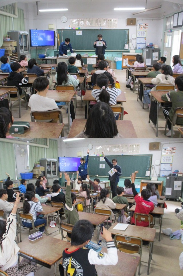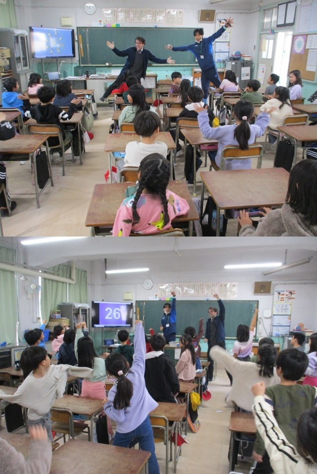 いつもは3~6年生の外国語活動や外国語の学習をサポートしていただいているC-NETの先生と一緒に、2年生の子どもたちが外国語(英語)に親しむ活動に取り組みました。子どもたちは、天気や曜日、”Hello”や”How are you.”等のあいさつ、1~100までの数、 ” I like ~. ” の表現等について音楽やリズムにあわせて元気に発声していました。体験的な活動を通して、とても楽しそうに、全身で外国語(英語)に親しんでいました。
