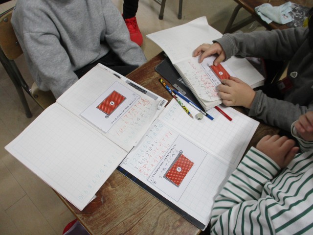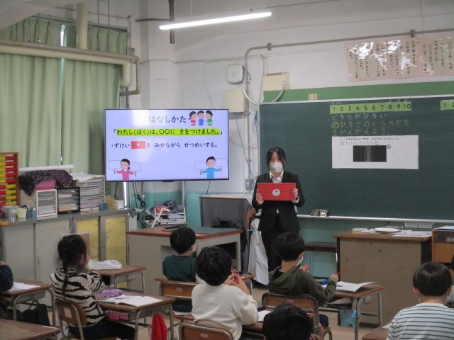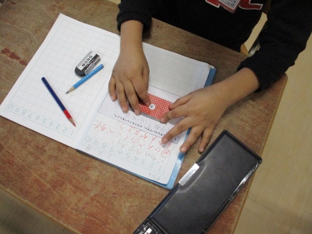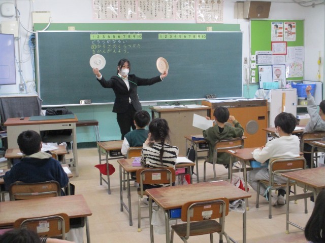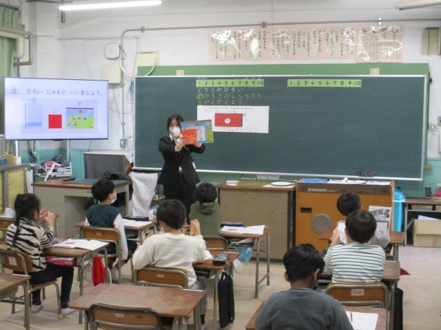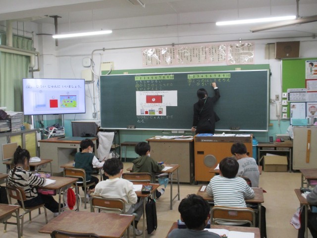 算数科「どちらがひろい」の学習で、「ひろさのくらべかたをかんがえよう」というめあてで学習に取り組んでいました。子どもたちは、図形をどのように重ねれば比べやすいか、自分が考えた比べ方を友だちと交流しながら、学習を深めていました。