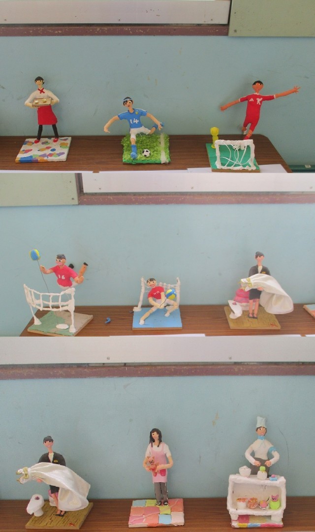 6年生の教室前に、未来のパティシエ、サッカー選手やバレーボール選手、保育士たちがずらりと並んでいます。6年生が図画工作科の学習で制作した「未来の私」を想像した作品です。鮮やかな色彩や躍動感あふれるポーズが見どころです。子どもたちが抱くキラキラとした未来への希望が、一つ一つの作品から伝わってきます。学校へお越しの際は、ぜひご覧ください。