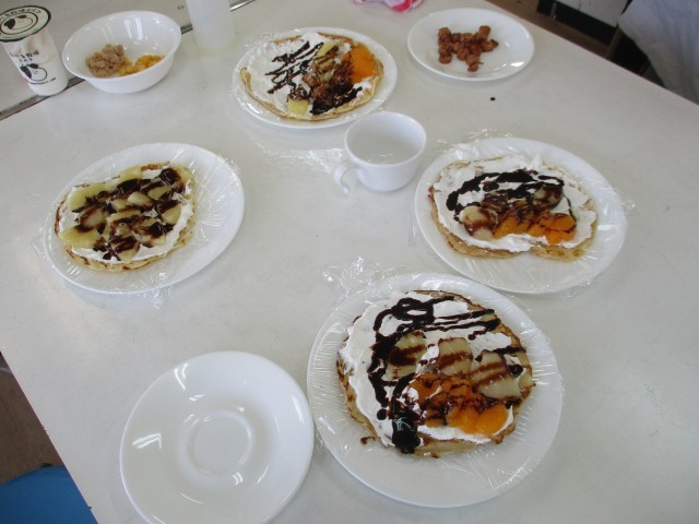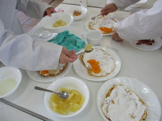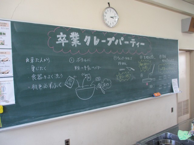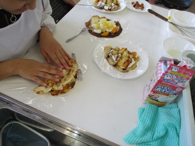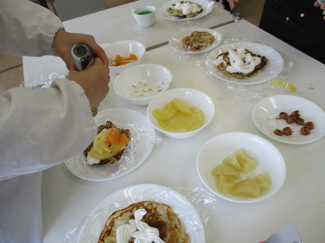 小学校生活最後の調理実習、6年生は「クレープ作り」に挑戦しました。生地を薄く、丸く焼いた後はトッピング。子どもたちは、フルーツや生クリーム、チョコソースなどを思い思いにトッピングし、彩り豊かなオリジナルクレープが完成しました。教室中が甘い香りと笑顔に包まれました。またひとつ、小学校生活の楽しい思い出ができました。