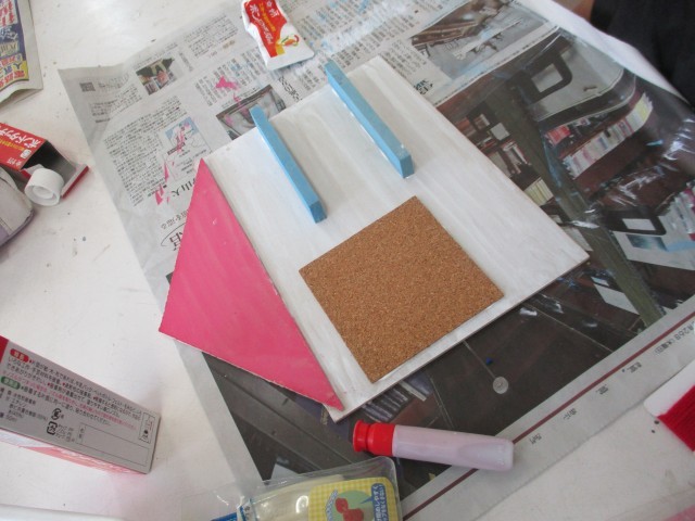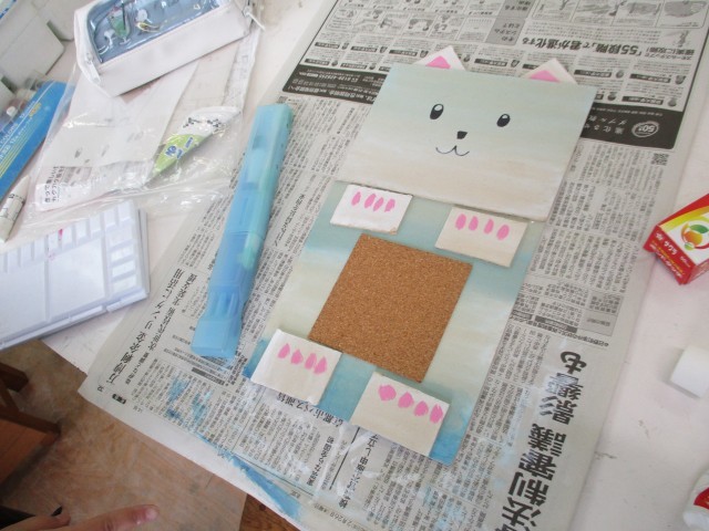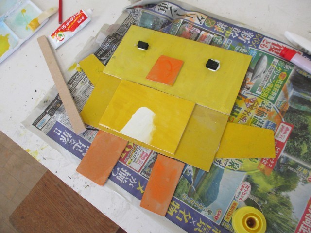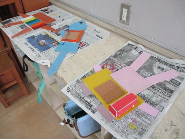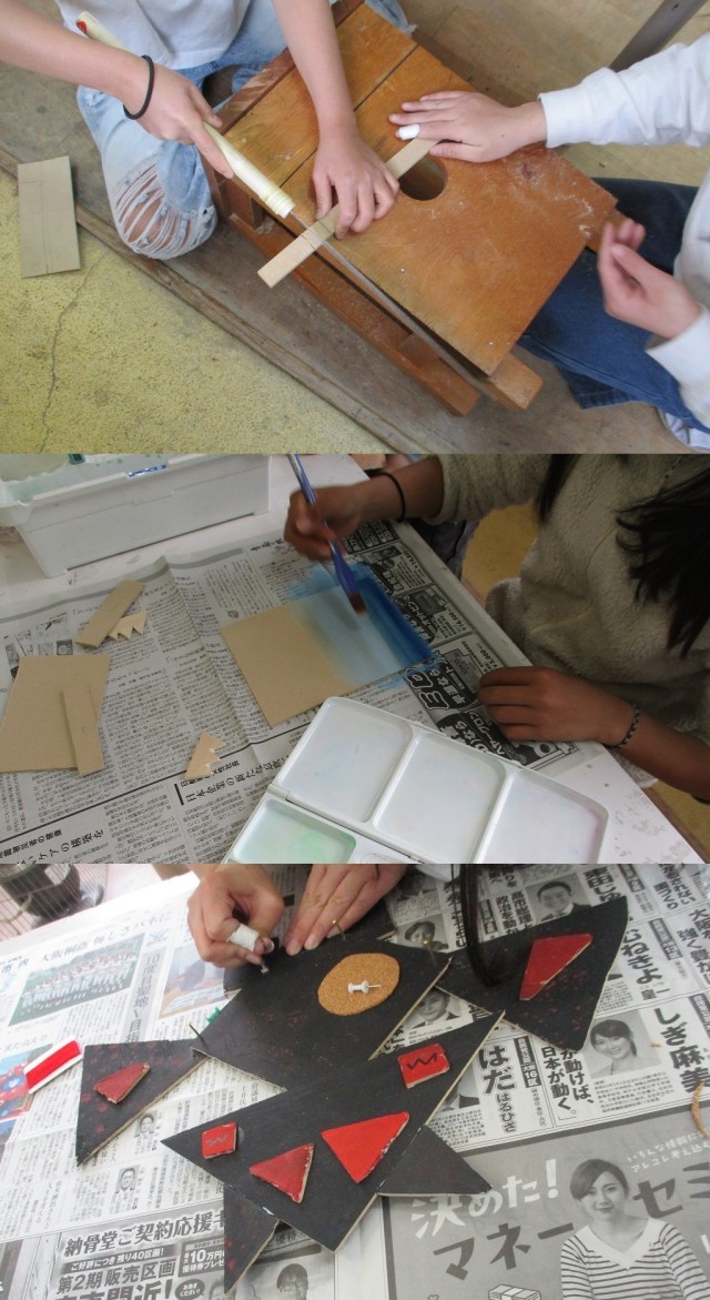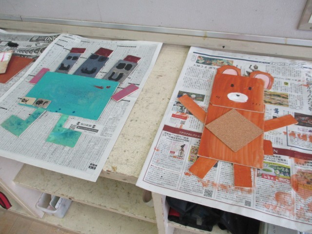 図画工作科「きって楽しい きっと使える」の学習で、メッセージボードやペン立てとして使えるものを作っていました。のこぎりで木を切った後、絵の具で色塗りしたり、部品を取り付けたりしていました。完成後は、お家で大事に使ってね。