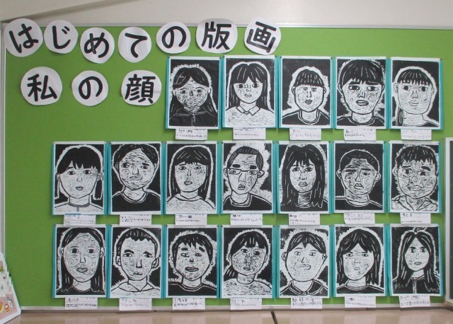 4年生の教室、5年生の教室前廊下に図画工作科で取り組んだ版画の作品が掲示されていました。自分の顔を題材にしていましたが、どの作品も自分の顔の特徴をよくとらえており、とても上手にできていて、たいへん驚きました。みなさんは、どれが誰の作品かわかりましたか?