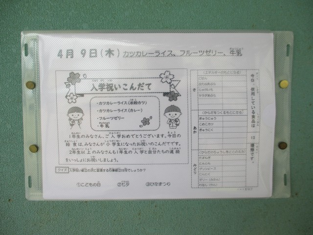 今日、4月9日(木)より給食が始まりました。今日の献立は「カツカレーライス・フルーツゼリー・牛乳」でした。1年生にとっては、小学校生活初めての給食でしたが、6年生による運搬・配膳のお手伝いのおかげで、たいへんスムーズに給食を行うことができていました。1年生のみなさん、初めての給食はおいしかったですか?