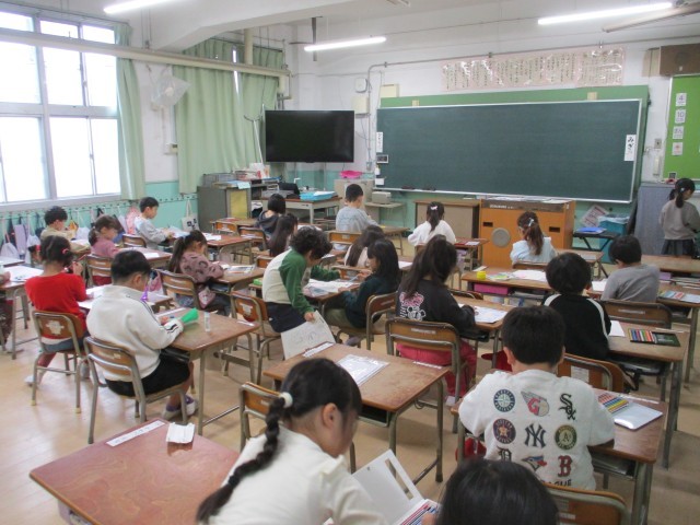 この日はあいにくの雨模様でした。運動場に出ることができないので、子どもたちは塗り絵をしたり、自由帳をかいたり、めいろをしたり、折り紙を折ったり…。思い思いに休み時間を過ごしていました。