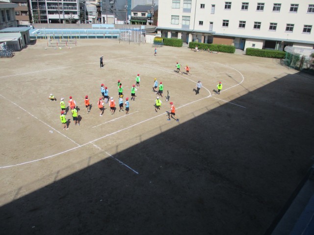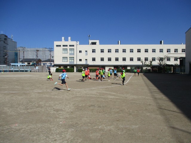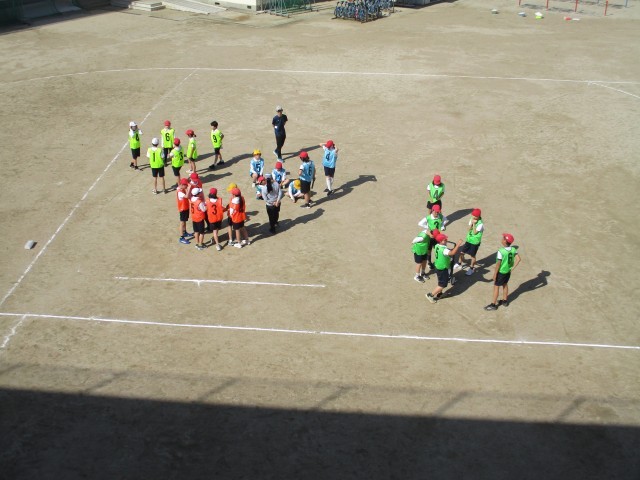突き抜けるような青空の下、6年生が体育科の学習でリレーに取り組んでいました。ショートカットコースをどのように使うか、チームで作戦を立て、一生懸命走る子どもたちの姿がとても印象的でした。