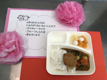 今年度の給食がはじまりました。入学のお祝い献立「カツカレーライス」「フルーツ白玉」「牛乳」です。人気のカレーライスに、一口トンカツを添えて食べます。1年生にとってはじめての給食ですが、とてもよく食べていました。