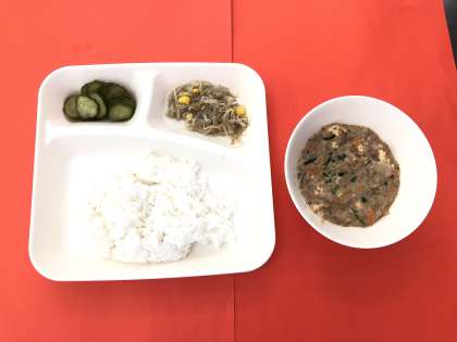今日の献立は、「マーボーどうふ」「きゅうりの甘酢づけ」「もやしとコーンのごまいため」「ごはん」「牛乳」です。マーボーどうふは、中国の四川料理の一つです。