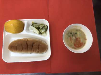 今日の献立は、「コーンクリームシチュー」「キャベツときゅうりのサラダ」「かわちばんかん」「おさつパン」「牛乳」です。かわちばんかんは、熊本市河内町で発見されたブンタンの仲間で、その地名の「河内」と「晩成のかんきつ類」ということで名付けられました。果汁が豊富で皮がむきやすく、子どもたちに好評な果物です。