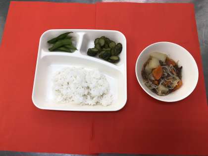 今日の献立は、「肉じゃが」「きゅうりのかつお梅風味」「えだまめ」「ごはん」「牛乳」です。肉じゃがは、甘辛く味付けした定番の煮ものです。明日は、カレースパゲッティが登場します。