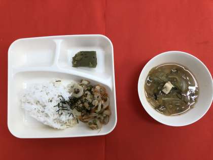 今日の献立は、「かやくご飯」「みそ汁」「まっ茶ういろう」「牛乳」です。「まっ茶ういろう」は、上新粉を使った手作りの和風デザートです。新茶の季節を子どもたちに知らせたいと思い、5月の献立としています。