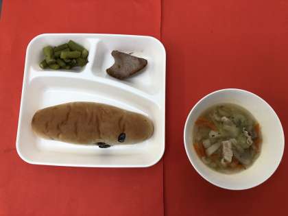 今日の献立は、「かつおのガーリック焼き」「鶏肉とじゃがいものスープ」「グリーンアスパラガスのサラダ」「レーズパン」「牛乳」です。グリーンアスパラガスは、カロテンやビタミンC、ビタミンEなどを豊富に含みます。