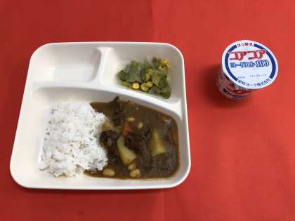 今日の献立は、「牛肉と大豆のカレーライス」「レタスとコーンのサラダ」「ヨーグルト」「牛乳」です。大豆煮を使用した毎年好評なカレーライスです。