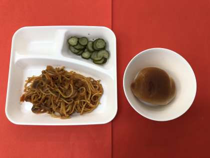 今日の献立は、「スパゲッティミートソース」「きゅうりのバジル風味サラダ」「黒糖クレセントロールパン」「牛乳」です。6月は野菜が夏野菜に変わってきます。全体的な味つけとして、気温が高い中でも食べやすいように、赤じそや梅肉、柑橘類の果汁を使用し酸味をいかした献立が登場します。