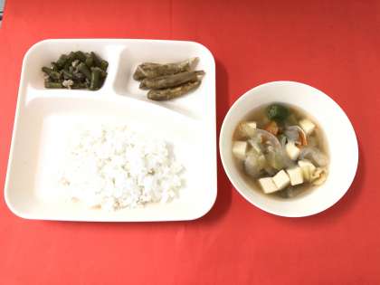 今日の献立は、「いわしてんぷら」「すまし汁」「豚肉と三度豆のいためもの」「ごはん」「牛乳」です。いためものは、旬のさんどまめの味を楽しめるようにしています。
