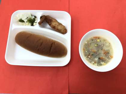 今日の献立は、「サーモンフライ」「豆乳スープ」「キャベツとさんどまめのサラダ」「黒糖パン」「牛乳」です。