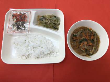 今日の献立は、「マーボーはるさめ」「チンゲンサイともやしの甘酢あえ」「アーモンドフィッシュ」「ごはん」「牛乳」です。マーボーはるさめは、少し辛味をきかせた味つけで、子どもたちに好評なご飯がすすむ献立です。