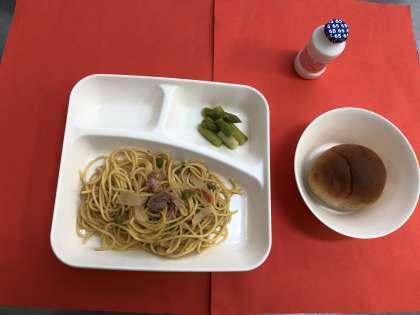 今日の献立は、「ポークトマトスパゲッティ」「グリーンアスパラガスのサラダ」「発酵乳」「黒糖クレセントロールパン」「牛乳」です。夏が旬の生のトマトの酸味を生かした麺献立です。