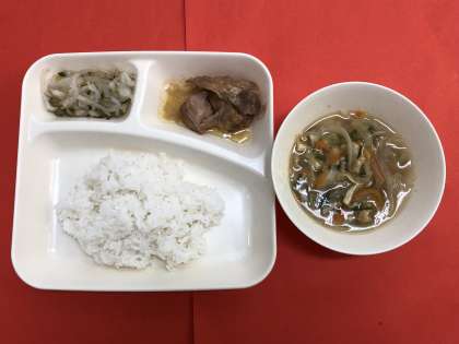 今日の献立は、「鶏肉のしょうゆマヨネーズ焼き」「五目汁」「切干しだいこんのゆずの香あえ」「ごはん」「牛乳」です。明日は、年1回のすいかが登場します。