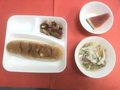 今日の献立は、「鶏肉と夏野菜のソテー」「押麦のスープ」「すいか」「おさつパン」「牛乳」です。水分を多く含んだすいかは、夏の暑い時期に水分補給としても効果的な食べ物です。給食では、1つのすいかを64等分に切り分けます。