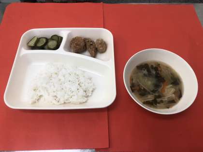 今日の献立は、「豚肉の香味あげ」「みそ汁」「きゅうりの甘酢づけ」「ごはん」「牛乳」です。暑くて食欲がないときには、カレー、こしょうなどの香辛料や、にんにく、しょうが、パセリなどの香りのある野菜は、食欲を引き出します。酢やレモンなどのすっぱい味や、くだものが疲れをやわらげます。