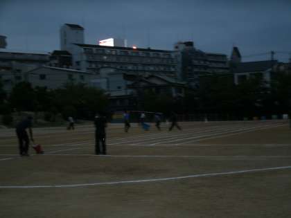 会議終了後の夕方薄暗くなった運動場で、ラインをひき直したり準備物を確認したりする多くの職員の姿が・・・