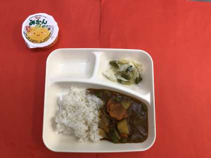 今日の献立は、「ビーフカレーライス(米粉)」「野菜のピクルス」「みかんゼリー」「牛乳」です。子どもたちにとても好評でした。