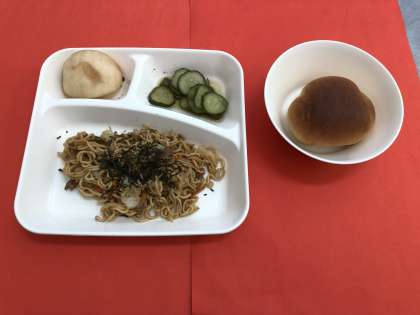 今日の献立は、「焼きそば」「きゅうりの甘酢づけ」「なし(二十世紀)」「黒糖クレセントロールパン」「牛乳」です。