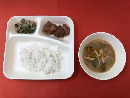 今日の献立は、「鶏肉のてり焼き」「みそ汁」「野菜いため」「ごはん」「牛乳」です。旬のかぼちゃを使用したみそ汁です。