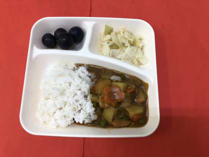 今日の献立は「チキンカレーライス(米粉)」「キャベツのピクルス」「ぶどう(巨峰)」「牛乳」です。小麦アレルギーの子どもに配慮した米粉のカレールウの素で味付けしたカレーライスは毎回好評な献立です。