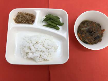 今日の献立は、「マーボーなす」「もやしのごま酢あえ」「えだまめ」「ごはん」「牛乳」です。旬のなすを使った、子どもたちに好評な献立です。